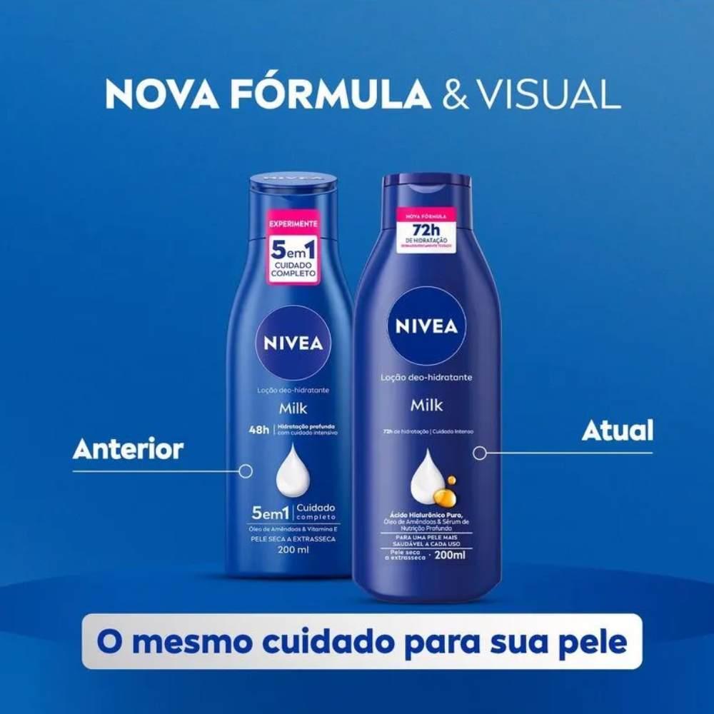 *Produto Original* *Atenção:* Venda exclusiva para pessoa física. Pedidos com CNPJ serão cancelados. NIVEA Milk, Loção Hidratante Desodorante Corporal, foi especialmente desenvolvido para a pele extrasseca. Ele nutre, desodoriza e proporciona um intensivo cuidado diário, deixando-a visivelmente macia e sedosa por mais de 24 horas. Sua fórmula com alto poder de hidratação contém Óleo de Amêndoas e Minerais Naturais, que agem profundamente, reduzindo o ressecamento e a aspereza da pele extrasseca. Com a exclusiva tecnologia Hydra QI: HIDRATAÇÃO DE DENTRO PARA FORA POR MAIS DE 24H. Estimula a formação de novas aquaporinas, o sistema de hidratação natural da própria pele.