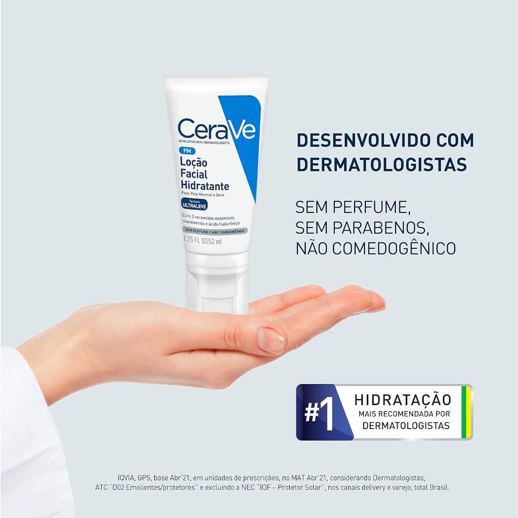 Loção Facial Hidratante CeraVe - Pele Normal a Seca - 52ml A Loção Facial Hidratante CeraVe foi desenvolvida para oferecer hidratação profunda e duradoura para peles normais a secas. Com fórmula leve e de fácil absorção, ela restaura e protege a barreira natural da pele, proporcionando um toque macio e saudável ao longo do dia. Principais Características: - Fórmula Leve e Não Oleosa: Hidrata sem deixar a pele pesada ou pegajosa. - Com Ceramidas e Ácido Hialurônico: Auxilia na restauração e retenção da umidade natural da pele. - Tecnologia MVE: Libera ingredientes ativos ao longo do dia, garantindo hidratação prolongada. Benefícios: - Hidrata e ajuda a restaurar a barreira protetora da pele. - Fórmula dermatologicamente testada, sem perfume e não comedogênica. - Indicado para uso diário, inclusive em peles sensíveis. - Absorção rápida e acabamento suave. Diferenciais do Produto: - Desenvolvido com dermatologistas. - Indicado para peles normais a secas. - Livre de fragrâncias e irritantes comuns. Especificações Técnicas: - Peso: 52ml - Textura: Loção leve Instruções de Uso: - Aplique sobre a pele limpa e seca, massageando suavemente até completa absorção. - Pode ser usado de manhã e à noite. Avisos e Precauções: - Uso externo. - Evitar contato com os olhos. Em caso de contato, enxaguar com água abundante. - Suspender o uso em caso de irritação e procurar orientação médica. - Manter fora do alcance de crianças. O que está incluso? - 1 Frasco de 52ml da Loção Facial Hidratante CeraVe. ---- Dúvidas Frequentes ---- Os produtos são originais? Sim. Todos os nossos produtos são originais. Emitem nota fiscal? Sim. Emitimos nota fiscal para todos os pedidos.