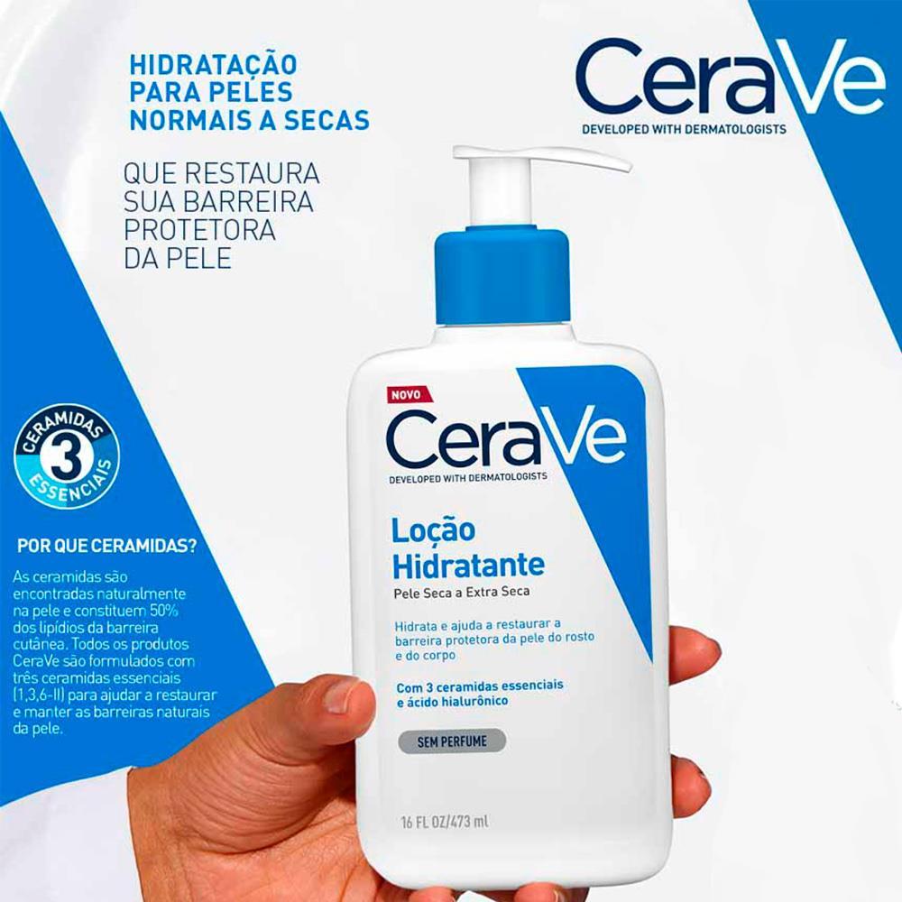 A CeraVe Loção Hidratante é um hidratante corporal e facial desenvolvido com dermatologistas para pele seca a extra seca, oferecendo hidratação prolongada e restauração da barreira cutânea com fórmula leve e de rápida absorção. Enriquecida com 3 ceramidas essenciais, ácido hialurônico e tecnologia MVE, promove hidratação contínua ao longo do dia, deixando a pele macia, suave e confortável sem sensação oleosa. A loção é sem óleo, sem fragrância e não comedogênica, sendo ideal para pele sensível e uso diário no rosto e corpo. Sua textura fluida ajuda a manter a umidade natural da pele, reduzindo o ressecamento e melhorando a aparência da pele ao longo do tempo. Principais Benefícios Hidratação prolongada e contínua Ajuda a restaurar e fortalecer a barreira natural da pele Fórmula leve, fluida e de rápida absorção Sem óleo, sem fragrância e não comedogênica Ideal para pele seca, extra seca e sensível Pode ser usada no rosto e no corpo Desenvolvida com dermatologistas Ingredientes Destacados Ceramidas essenciais: restauram a barreira da pele Ácido hialurônico: retém a hidratação Tecnologia MVE: liberação gradual dos ativos Como Usar Aplique a CeraVe Loção Hidratante sobre a pele limpa e seca, espalhando até completa absorção. Use diariamente, especialmente após o banho ou sempre que sentir necessidade. Indicação Produto indicado para uso diário no corpo e rosto, ideal para pessoas com pele seca, sensível ou ressecada, inclusive em rotinas dermatológicas.