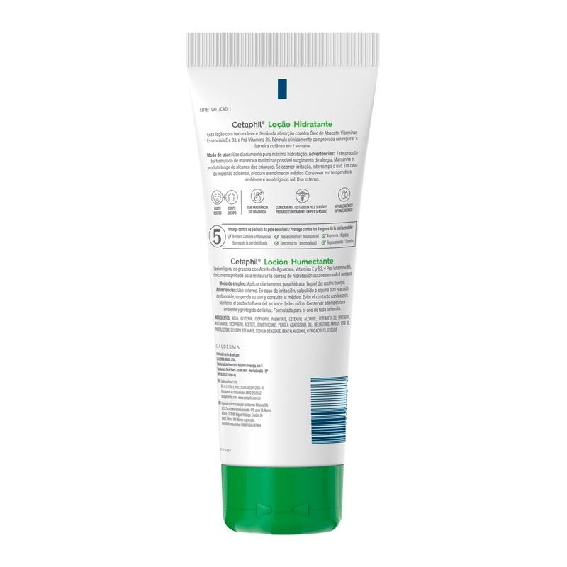 Loção Hidratante Cetaphil 200ml Loção Hidratante Cetaphil tem hidratação imediata e intensa por 48 horas, fórmula clinicamente comprovada em reparar a barreira cutânea em 1 semana, tem na sua composição o óleo de Abacate, vitaminas essenciais E e B3 e Pró-Vitamina B5, responsáveis por reparar a barreira cutânea, Cetaphil é um produto hipoalergênico e clinicamente testado em peles sensíveis, além de ser recomendado por dermatologistas.