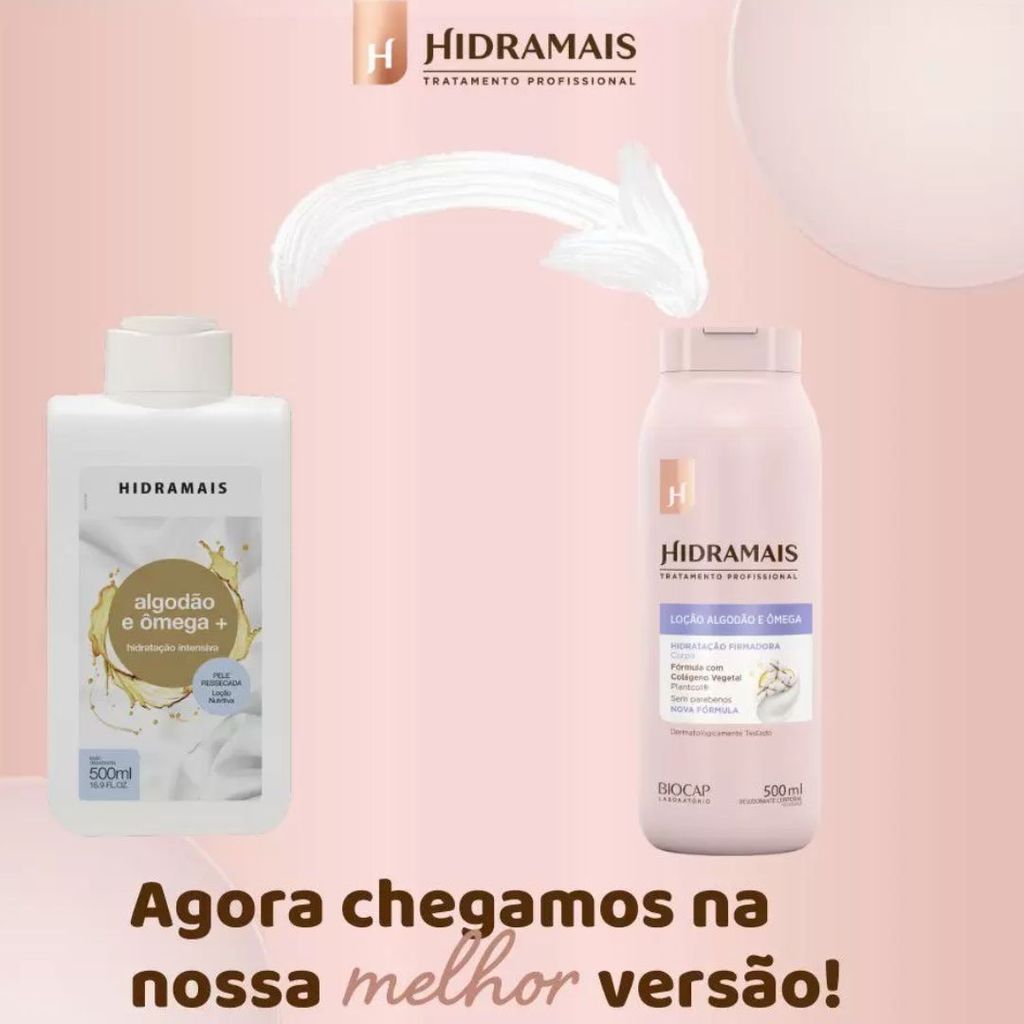 A Loção Hidratante Corporal Hidramais Algodão E Ômega 500ml foi especialmente desenvolvida para peles ressecadas, proporcionando nutrição, deixando a pele mais elástica, macia e com perfume suave. possui formulação leve, não oleosa e é enriquecida com Colágeno Vegetal. Tem ação desodorante e hidratante, com uma fragrância intensa e marcante. Desodoriza, hidrata e melhora a textura da pele, proporcionando um toque aveludado. Benefícios: - Formulação leve e não oleosa; - Toque aveludado; - Hidratação. Modo de usar: Aplique sobre a pele limpa e espalhe uniformemente. Sobre a marca: Fundada em 2003, a Hidramais é uma empresa brasileira voltada para os cuidados com a pele, que busca aliar beleza, saúde e bem-estar para oferecer produtos de alta qualidade para tratamentos corporais e faciais. Para a Hidramais, beleza representa saúde e cuidado, e por isso, a marca apresenta dedicação em cada etapa: desde a escolha das matérias-primas e dos fornecedores, e se estende por todo o processo, até a distribuição dos produtos.