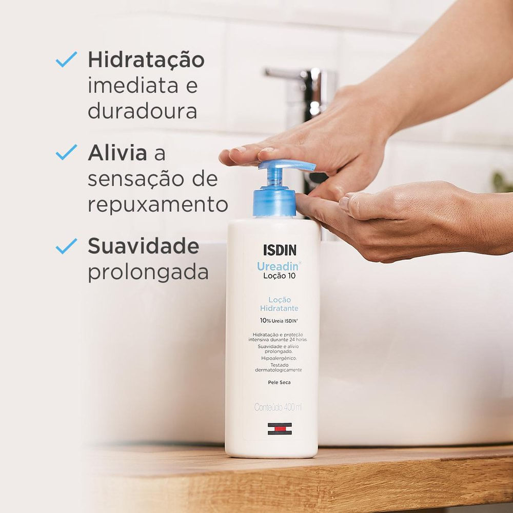 Loção Hidratante Corporal Isdin Ureadin 10% Para pele seca. Hidratação intensiva 24h. Ajuda a aliviar a sensação de repuxamento da pele. Loção corporal hidratante para o cuidado diário e proteção da p