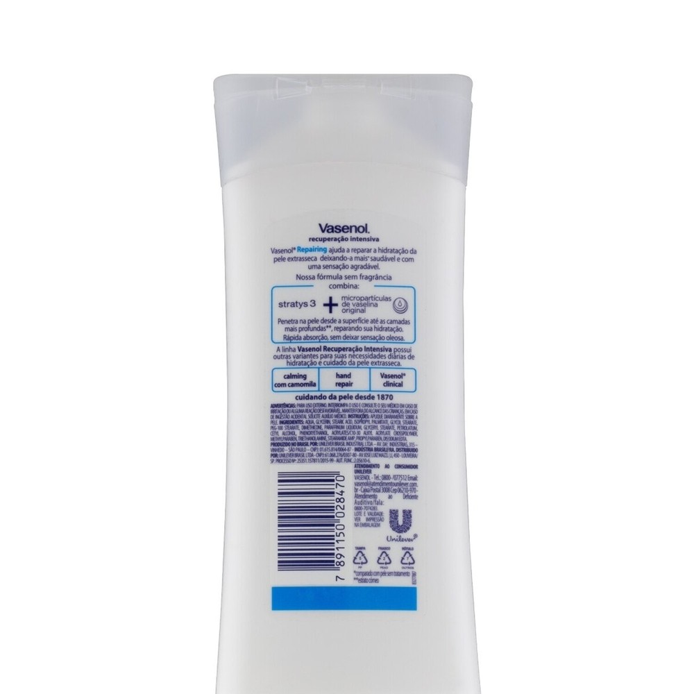O Hidratante Vasenol Recuperação Intensiva Repairing é indicado para quem tem pele extrasseca. Ele promete uma hidratação intensa e de longa duração. Não deixa sensação oleosa, e penetra até as camadas mais profundas da derme. Sua fórmula conta com micropartículas de vaselina para uma reparação ainda mais eficiente. Também cria uma camada protetora que impede a perda de umidade, mantendo uma hidratação constante e eficaz. Ele não contém perfume, o que diminui os riscos de alergia e irritações.