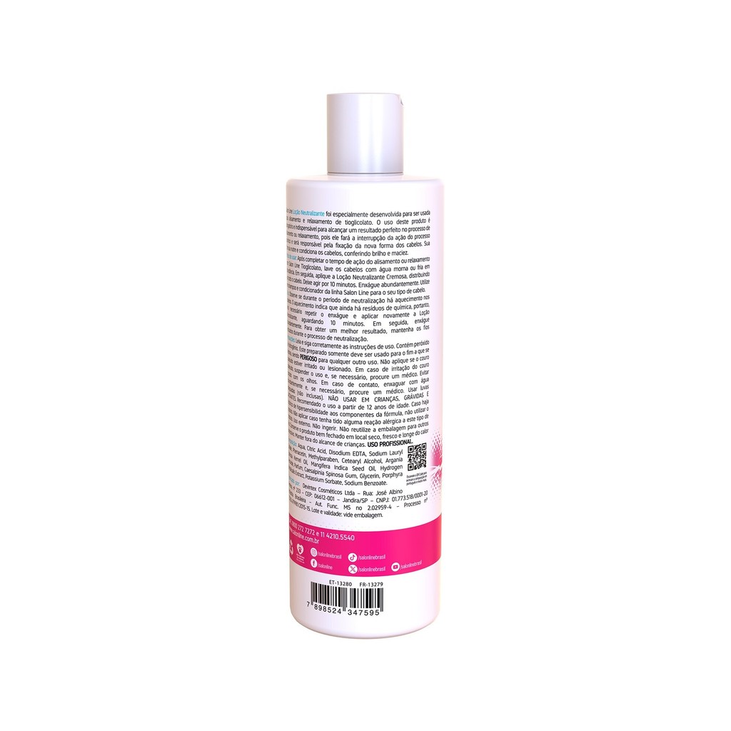 A Loção Neutralizante Cremosa foi especialmente desenvolvida para ser usada após o alisamento e o relaxamento de Tioglicolato. O uso é obrigatório e indispensável para alcançar um resultado perfeito, pois ele fará a interrupção da ação do processo químico e será responsável pela fixação da nova forma dos cabelos. INDICAÇÕES Para quais tipos de cabelo? Cabelos alisados ou relaxados. Qual a indicação? Para uso com Tioglicolato. Pode usar a partir de quantos anos? A partir de 12 anos. ATIVOS Quais os principais ativos? Sua fórmula é enriquecida com óleo de argan, óleo de manga e colágeno para os cabelos, nutre e condiciona os fios, garantindo brilho e maciez. MODO DE USO Qual a melhor forma de usar? Após completar o tempo de ação do alisamento ou relaxamento com Salon Line Tioglicolato, lave os cabelos com água morna ou fria em abundância. Em seguida, aplique a Loção Neutralizante Cremosa distribuindo por todo o cabelo. Deixe agir por 10 minutos. Enxágue abundantemente. Utilize um shampoo e condicionador da linha Salon Line para o seu tipo de cabelo. Dicas de uso Observe se durante o período de neutralização, há aquecimento nos cabelos. O aquecimento indica que ainda há resíduos de química, portanto será necessário repetir o enxágue e aplicar novamente a Loção, aguardando 10 minutos. Em seguida enxágue abundantemente. Para obter um melhor resultado, mantenha os fios esticados durante o processo de neutralização. CARACTERÍSTICAS É produto vegano? O produto não é vegano. É liberado? O produto não é liberado.