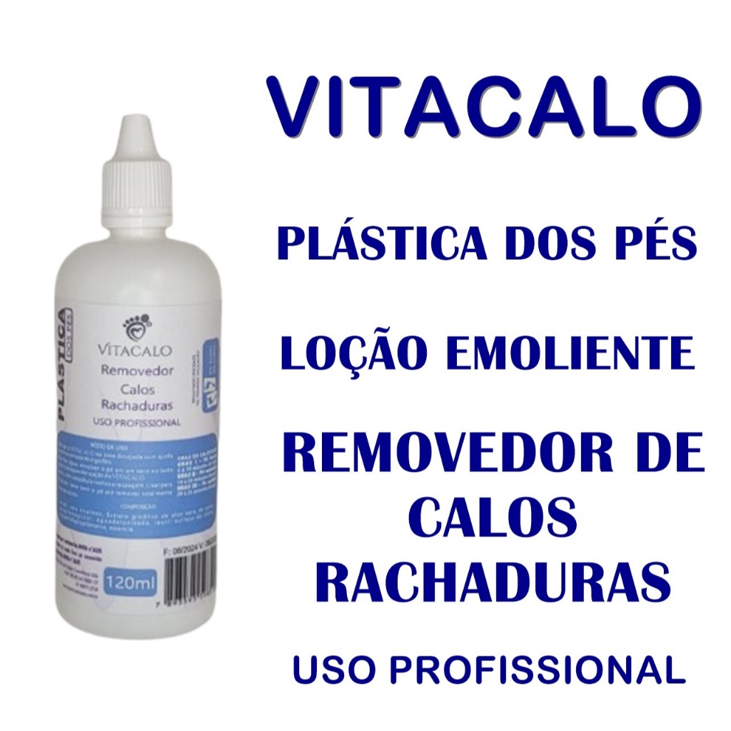 Bem vindos ao nosso anúncio!! Contém: 01 Frasco Loção Removedor de Calosidade Vitacalo - 120ml Aplicar o Vitacalo na área desejada com ajuda ,uma fina camada de algodão. Borrifar água, envolver o pé na bota plástica descartável e aguardar a ação do VITACALO. Após, com a espátula para calosidades realize a raspagem. Para finalizar você, se preferir , pode lixar. Lave bem os pés até remover totalmente todo produto. OBSERVAÇÕES, PARA O GRAU DA CALOSIDADE: GRAU 1 - PÉS SUAVES 5 À 10 MINUTOS DE AÇÃO GRAU 2 - PÉS RESSECADOS 10 À 20 MINUTOS DE AÇÃO GRAU 3 - PÉS RACHADOS 20 À 25 MINUTOS DE AÇÃO NÃO APLICAR EM PELE LESIONADA, COM FERIMENTOS. MANTER FORA DO ALCANCE DAS CRIANÇAS. USO EXTERNO. PRODUTO REGISTRADO NA ANVISA Aguardamos sua compra!! Adquira já o seu!