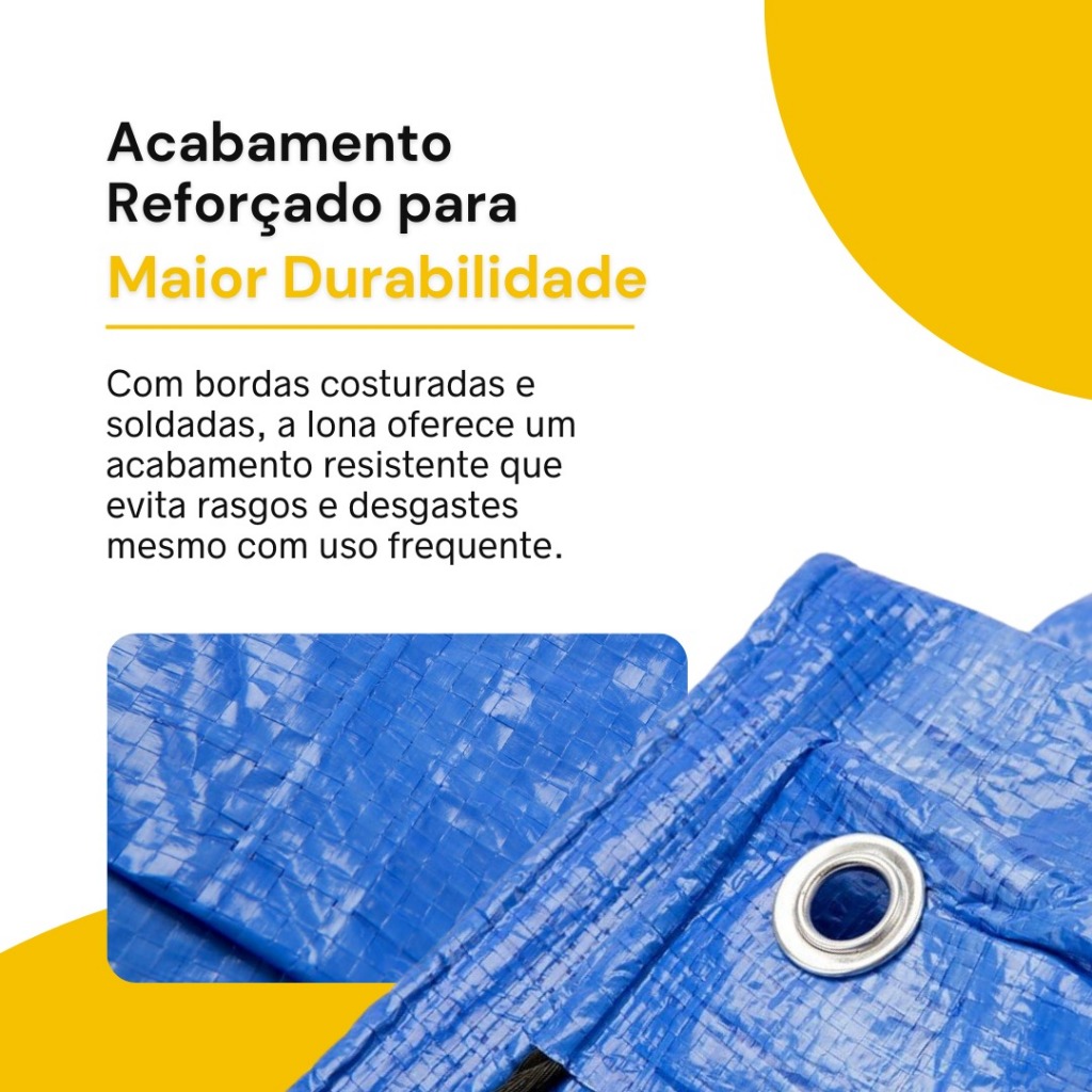 Lona de Excelente Qualidade, Impermeável, Fabricada com 70g/m2 e 100 Micras. Ilhoses Metálicos a cada 1m Ideal para Feiras Livres, Camping, Construção, Pesca, Indústria, Transporte, Praia, etc Material: Polietileno Espessura (micra): 100 Espessura (g/m²): 70 Comprimento (m): 2 Largura (m): 3 Cor: Azul Garantia (dias): 30