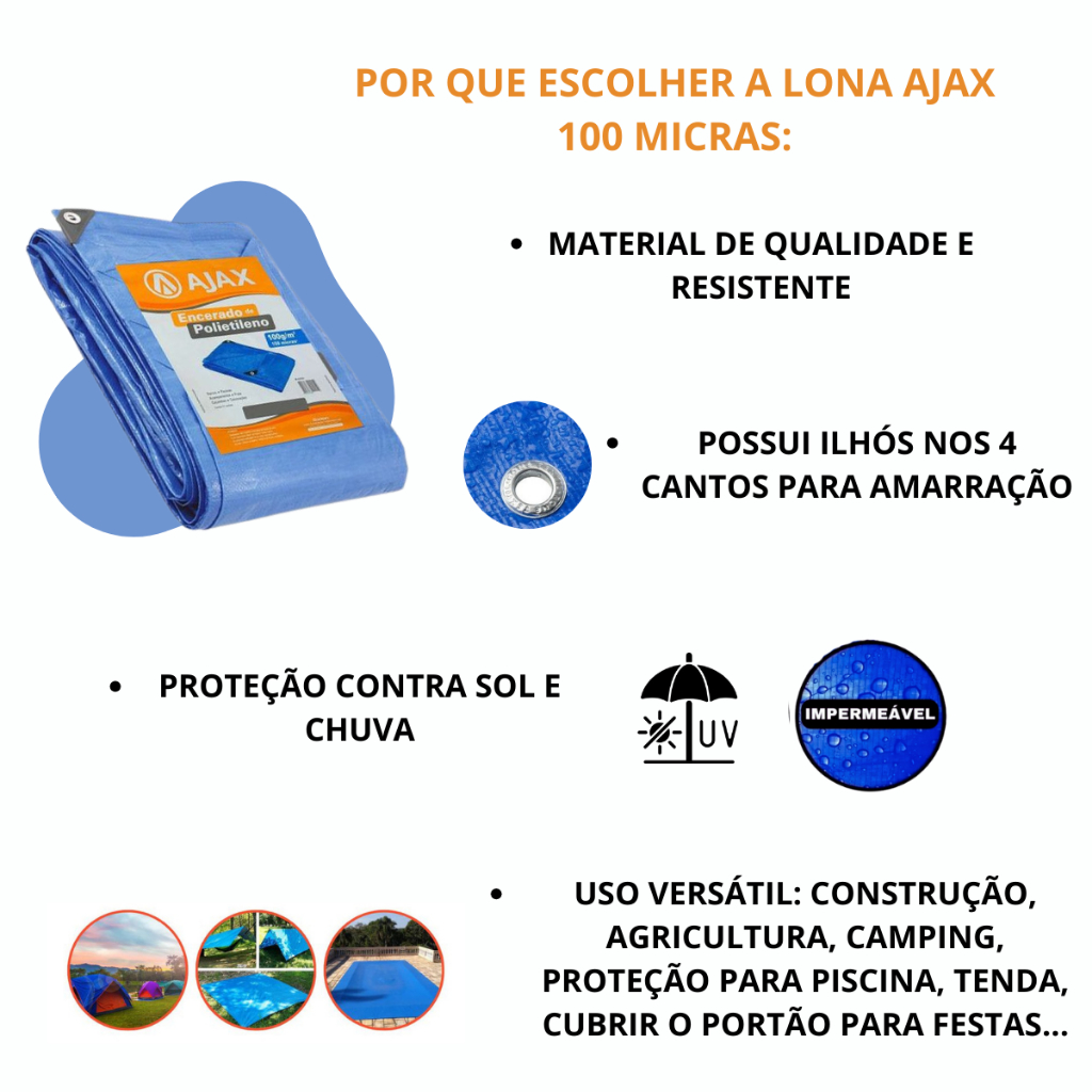Lona Plástica Encerado Impermeável 7 x 4 Metros Essa lona plástica pode ser utilizada em diversas ocasiões, perfeita para cobrir caminhões, telhados, quintais, piscinas e coberturas em geral, indicada para utilizar como forro e o que mais conseguir imaginar. Possui fio sintético ao redor da bainha, que permite cantos e dobras mais reforçados para maior durabilidade. Possui ilhoses, ou seja, furos com bordas metálicas reforçadas a cada 1 metro permitindo o uso de acessórios para fixação. Produto impermeável e com aditivo que protege contra os raios ultraviolentas, sendo resiste a sol e chuva. Especificações: *Material: Polietileno *Medidas: 7 metros x 4 Metros *Gramatura: 70g/m² *Possui proteção contra raios ultravioletas: Sim *Resistente a sol e chuva: Sim *Impermeável: Sim *Cor: Lona Azul *Produto Inflamável: Não