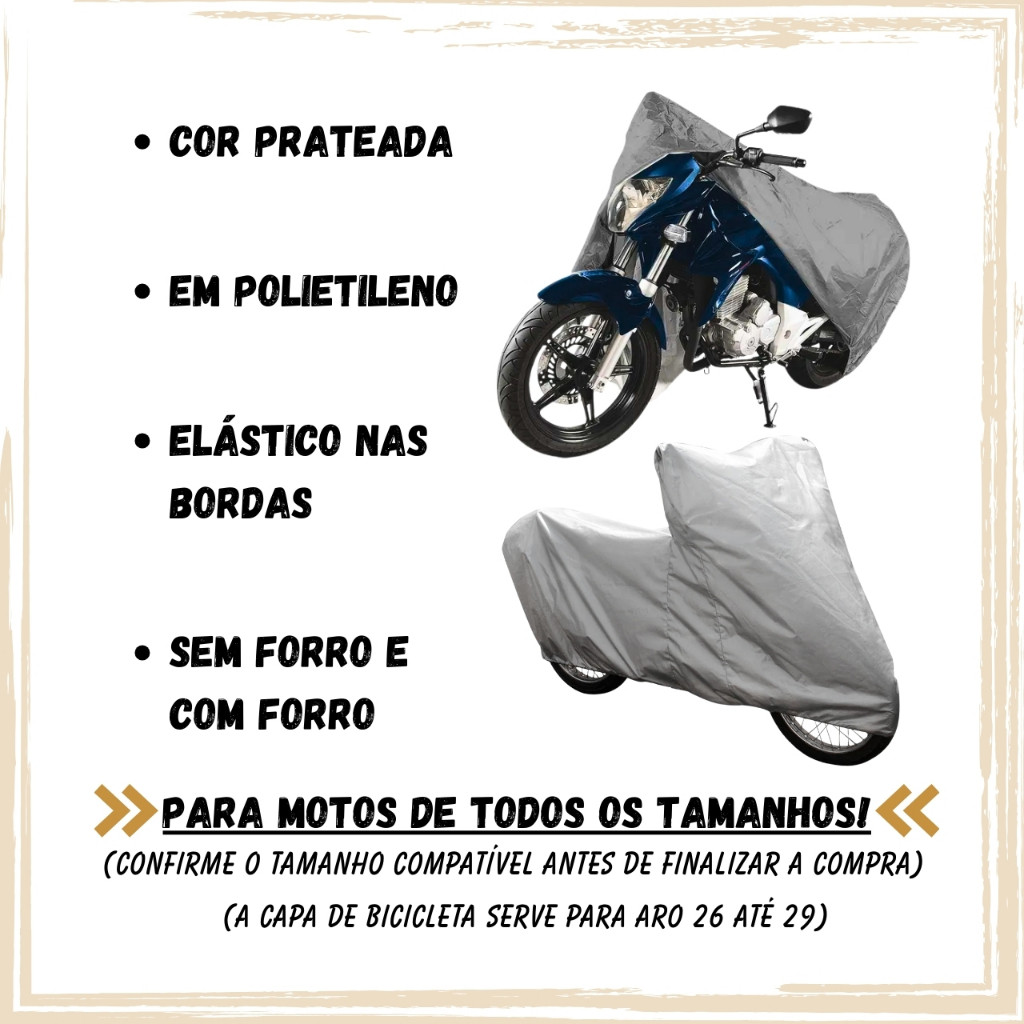 A Capa UV-BLOCK possui padrão alto de qualidade não se comparando a capas comuns do mercado, fabricada com polietileno de qualidade e aditivos que auxiliam na proteção contra os raios UV, a capa UV-BLOCK proporciona maior durabilidade e proteção. 100% impermeável, oferecendo proteção contra intempéries e outras ameaças; sol, chuva, dejetos de animais e poeira. Mantenha a pintura da sua motocicleta intacta. Escolha entre uma capa com ou sem forro de acordo com sua necessidade; O forro é uma camada extra de proteção, prevenindo riscos na pintura e regulando a temperatura da capa, ideal para garagens abertas ou veículos expostos ao tempo. Disponível em diversos tamanhos, confira a tabela de medidas que se encontra nas fotos do anúncio. Atendimento De Qualidade | 100% Seguro | Satisfação Garantida Informações técnicas: Marca: UV-BLOCK Tamanhos: P / M / G / GG Material: CAPA POLIETILENO; FORRO TNT. Forração: Opção com forro e sem forro disponíveis. Cor: Prateada com aditivo UV. Aplicação: Motos. Produto novo direto da fábrica. Especificações: - Não Risca a Pintura. - 100% Impermeável. - Utilização em Garagens Cobertas e Descobertas. - Protege sua Motocicleta do Sol, Chuva e Poeira. - Fixação Firme com Elástico nas Bordas. - Fácil Instalação. Itens inclusos: 1 Capa ATENÇÃO: É recomendado aguardar o escapamento da moto ESFRIAR antes da instalação. Certifique-se que o veículo esteja seco e limpo. NÃO NOS RESPONSABILIZAMOS POR MAU USO.