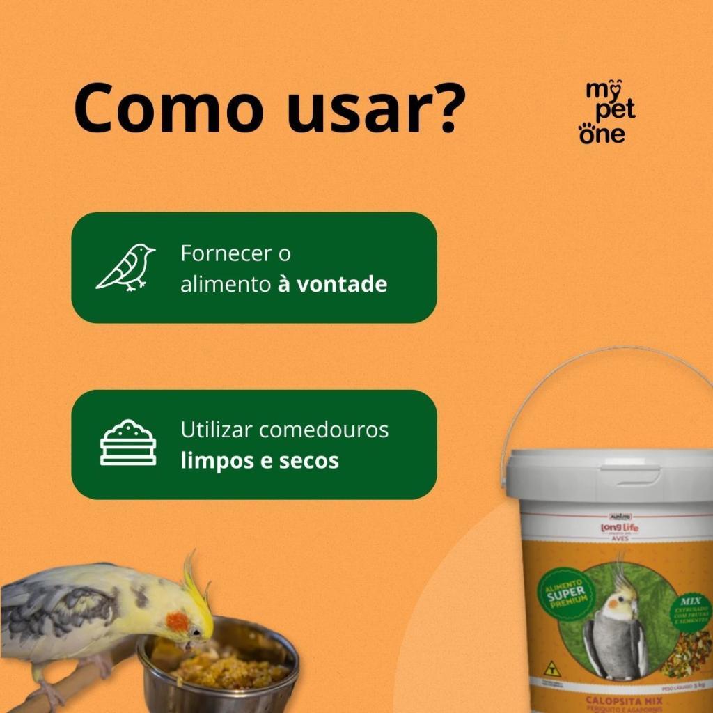 Long Life Pequenos Pets Calopsita com Frutas – Completa A Long Life Calopsita com Frutas é um alimento composto completo e extrusado desenvolvido para psitacídeos de pequeno e médio porte. Sua formulação garante uma dieta racional e equilibrada, fornecendo a totalidade dos elementos nutritivos essenciais. É enriquecida com prebióticos (MOS e Beta-glucanas) e um complexo de probióticos (como Saccharomyces cerevisiae, Lactobacillus acidophilus, etc.), auxiliando na saúde intestinal e digestiva das aves. Contém também um blend de enzimas digestivas para melhor aproveitamento dos nutrientes, além de mamão desidratado e um rico premix vitamínico e mineral. Indicação: Alimento completo e balanceado para psitacídeos de pequeno e médio porte Ideal para Calopsitas, Periquitos e Agapornis Promove a saúde intestinal através de Prebióticos e Probióticos Auxilia na digestão com um complexo enzimático Modo de uso: Fornecer o alimento à vontade Utilizar comedouros limpos e secos Composição Nutricional (Mínimos e Máximos em g/kg ou conforme indicado): ComponenteMínimoMáximoUnidade Proteína Bruta150,00-g/kg Extrato Etéreo70,00-g/kg Matéria Fibrosa-100,00g/kg Matéria Mineral-85,00g/kg Umidade-120,00g/kg Cálcio5.000,0015,00mg/kg / g/kg Fósforo4.000,00-mg/kg Lisina7.000,00-mg/kg Metionina4.500,00-mg/kg Sódio200,00-mg/kg Ômega 62.500,00-mg/kg Ômega 32.000,00-mg/kg Mananoligossacarídeo (MOS)500,00-mg/kg Saccharomyces cerevisiae$4,30\times10^8$-UFC/kg Nota: Contém diversos outros aminoácidos, vitaminas, minerais e enzimas. Especificações: CaracterísticaDetalhe ProdutoAlimento completo extrusado para Psitacídeos UsoOral (ração) IndicaçãoCalopsitas, Periquitos, Agapornis AditivosPrebióticos, Probióticos e Enzimas Digestivas