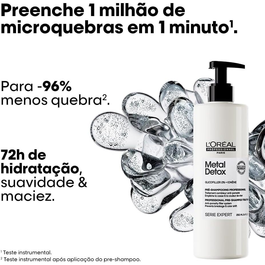 O Kit L'Oréal Professionnel Serie Expert Absolut Repair Inforcer Duo é formulado para fortalecer e reparar cabelos frágeis e danificados. Sua fórmula profissional possui uma textura em gel leve e concentrada, que penetra instantaneamente e profundamente na fibra capilar, proporcionando uma ação imediata, sem a necessidade de tempo de pausa. Além disso, os produtos são veganos, livres de sulfato, e contribuem para uma rotina de cuidado mais sustentável. Ao aplicar camadas de shampoo diretamente sobre o produto, elimina-se uma etapa de enxágue, o que reduz o consumo de água em comparação com um pré-shampoo clássico. Descoberta científica: Estudos indicam que os metais presentes na água se acumulam no cabelo a cada lavagem, sendo uma das principais causas de quebra capilar. Cabelos porosos são ainda mais vulneráveis, absorvendo até o dobro da quantidade de água com metais, o que aumenta os riscos de quebra. Processos químicos, ferramentas de calor e exposição aos raios UV causam microquebras na superfície capilar e cavidades no córtex, tornando o cabelo mais poroso e propenso a absorver esses metais, o que resulta em mais fragilidade e quebra. Benefícios: Redução da porosidade da fibra capilar Até 96% menos quebra após apenas uma aplicação Hidratação intensa por 72 horas, com suavidade e maciez Cabelos encorpados e visivelmente mais saudáveis Desembaraço instantâneo e eficiente Preparação do cabelo para a limpeza e maior eficácia no uso do shampoo Modo de usar: Separe o cabelo úmido em duas seções. Aplique de 2 a 4 pumps do produto em cada seção, focando no comprimento e pontas. Distribua o produto pelo cabelo por 1 a 2 minutos sem enxaguar. Aplique o Metal Detox Shampoo diretamente por cima do pré-shampoo. Para cabelos finos a médios, utilize de 2 a 3 pumps. Cabelos grossos podem necessitar de até 4 pumps. Esse kit oferece uma solução completa para a reparação de cabelos frágeis, combinando hidratação profunda e proteção contra danos futuros.