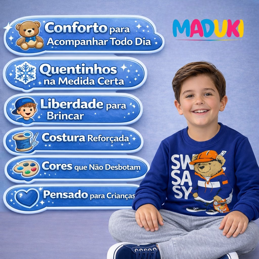 O anúncio contém: 05 casacos 05 calças Um conjunto mais lindo que o outro! Com apliques alegres e estilosos, como as crianças gostam! Fácil de lavar! Muito confortável! Tecido de qualidade! • Conjunto 85% algodão • Calça confeccionada na cor lisa e casaco estampado, conforme fotos. • Calças confeccionadas com elástico na cintura. • Calças e casacos possuem punho. Qual tamanho devo escolher? 👦 Tamanho: 1 -- Comprimento Casaco: 34 cm -- Busto: 27 cm – Comprimento Manga: 32 -- Comprimento Calça: 47 cm 💖 Indicado para 9-12 meses 👦 Tamanho: 2 -- Comprimento Casaco: 36 cm -- Busto: 28 cm – Comprimento Manga: 32 -- Comprimento Calça: 50 cm 💖 Indicado para 1-2 anos 👦 Tamanho: 3 -- Comprimento Casaco: 38 cm -- Busto: 29 cm – Comprimento Manga: 33 -- Comprimento Calça: 52 cm 💖 Indicado para 2-3 anos 👦 Tamanho: 4 -- Comprimento Casaco: 40 cm -- Busto: 30 cm – Comprimento Manga: 36 -- Comprimento Calça: 57 cm 💖 Indicado para 3-4 anos 👦 Tamanho: 6 -- Comprimento Casaco: 42 cm -- Busto: 32 cm – Comprimento Manga: 38 -- Comprimento Calça: 60 cm 💖 Indicado para 4-5 anos 👦 Tamanho: 8 -- Comprimento Casaco: 45 cm -- Busto: 34 cm – Comprimento Manga: 40 -- Comprimento Calça: 64 cm 💖 Indicado para 5-6 anos Aconselhamos um número acima do que a criança usa no momento, devido a forma dos nossos fabricantes ser menor. Nós, da BABYCHIC.MODAINFANTIL, Prezamos pela Satisfação, Confiança e Bem Estar de Nossos Clientes, por isso, só Trabalhamos com Produtos de Excelente Qualidade! Nossas Peças São Confeccionadas com Tecidos de Excelente Qualidade, Proporcionando Conforto, Bem Estar e Durabilidade! Precisa de Ajuda ou Tem Alguma Dúvida Sobre o(s) Produto(s), Envio ou Garantia? Por Favor, Nos Encaminhe Sua Mensagem Que Responderemos o Mais Breve Possível! A BABYCHIC.MODAINFANTIL Agradece a Preferência!