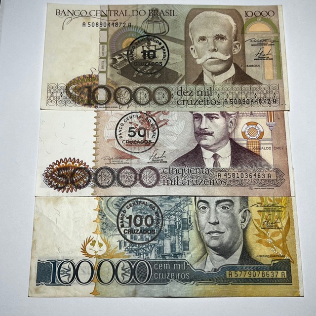 Lote 3 Cédulas Nacionais Com Carimbos de 10 50 e 100 Cruzados