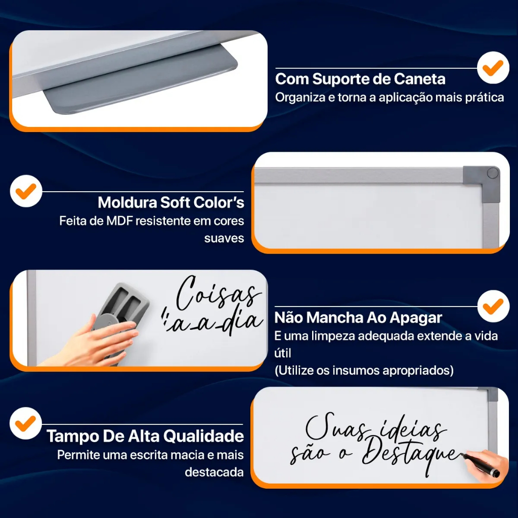 Lousa Branca Escolar Quadro Branco Moldura Soft Alumínio 120x90cm + 2 Canetas Marcadores
