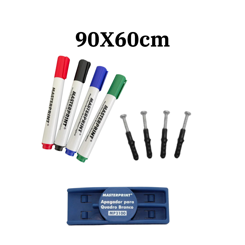 Lousa Branca Quadro Branco 90x60cm + 4 Pincel Marcadores + 1 Apagador Didática Média