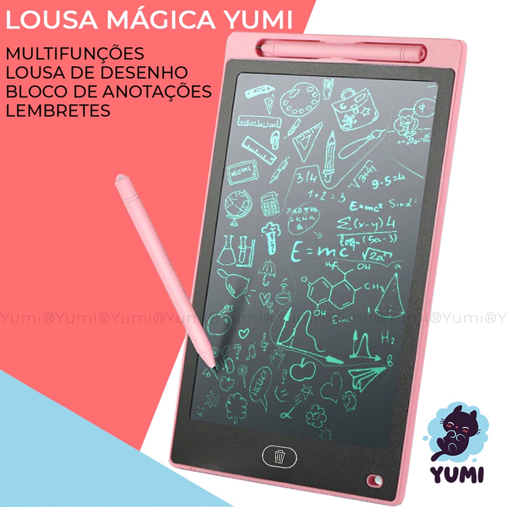 Prazer, nós somos a YUMI! Atualmente, a YUMI atende todos os estados brasileiros e já fez mais de um milhão de vendas online surpreendendo nossos clientes com produtos criativos, divertidos, de alta qualidade e originalidade. Criando uma experiência única, pela grande variedade de produtos acessíveis para todas as classes. Lousa Mágica Yumi! Estimule a imaginação e criatividade de seu filho! Seu filho está rabiscando a parede de sua casa? A imaginação dele está no ápice? Trouxemos a solução ideal para você! Sabemos que é de extrema importância estimular a imaginação de nossos filhos para que cresçam e sejam adultos criativos e independentes. A Lousa Mágica Yumi é perfeita para materializar todos os pensamentos das crianças. Para todas as idades A Lousa é uma ferramenta multiuso. Você pode deixar seu filho brincar e se divertir livremente, auxiliá-lo na tarefa de casa, deixar recados e muito mais. - Eco Friendly, elimina o uso de papel - Não é necessário o uso de tintas - Possui botão de apagar tudo - Escrita leve e precisa - Ultra Fino Produto já disponível em estoque no Brasil. Características: - Botão apagar - 8,5 polegadas - Caneta para escrever na lousa magica - Bloqueio de tela com botão liga/desliga na lateral Dimensões: - 23cm x 15cm x 0,4cm Conteúdo: - 1 lousa magica tablet LCD - 1 caneta de escrita na lousa