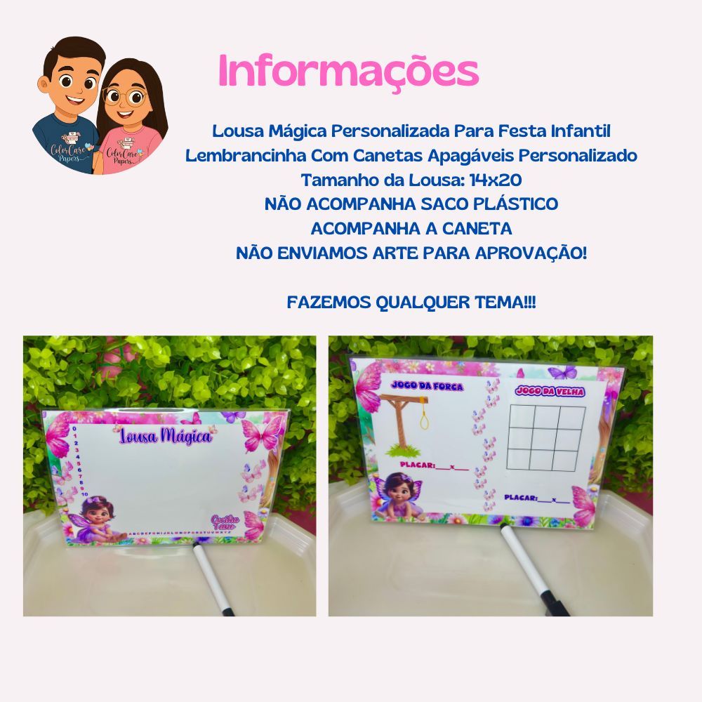 🎉 Olá Bem-vindo! Somos da Colorcare O PRAZO DE PRODUÇÃO SÃO 7 DIAS (( ÚTEIS)) ✨Fazemos qualquer tema personalizado -( Caso desejar colocar nome e idade na arte, avisar no chat em até 24 horas) - NÃO ENVIAMOS ARTE PARA APROVAÇÃO IMPORTANTE: 🌈 As cores das canetinhas será sempre preta. LOUSA COM CANETINHA: 🖍️ Lousa impressa frente e verso com canetinha hidrográfica. Características Principais: Tamanho da Lousa: 14 x 20 cm (metade de uma folha A4) Tipo de marcador: Permanente Material Da Lousa: Papel 180g Plastificado no de 125g Informações Importantes: ENVIE NOME E IDADE NO ATO DA COMPRA! SE CASO NÃO FOR INFORMADO NO PRAZO DE 24h MOMENTO DE APROVAÇÃO DA COMPRA ENVIAREMOS SEM NOME OU IDADE PARA EVITAR ATRASOS 🕐 ⏳ Fique atento ao prazo de produção e confirme com a data do seu evento , pois não nos responsabilizamos por atraso da transportadora Qualquer dúvida estamos à disposição! 🤗