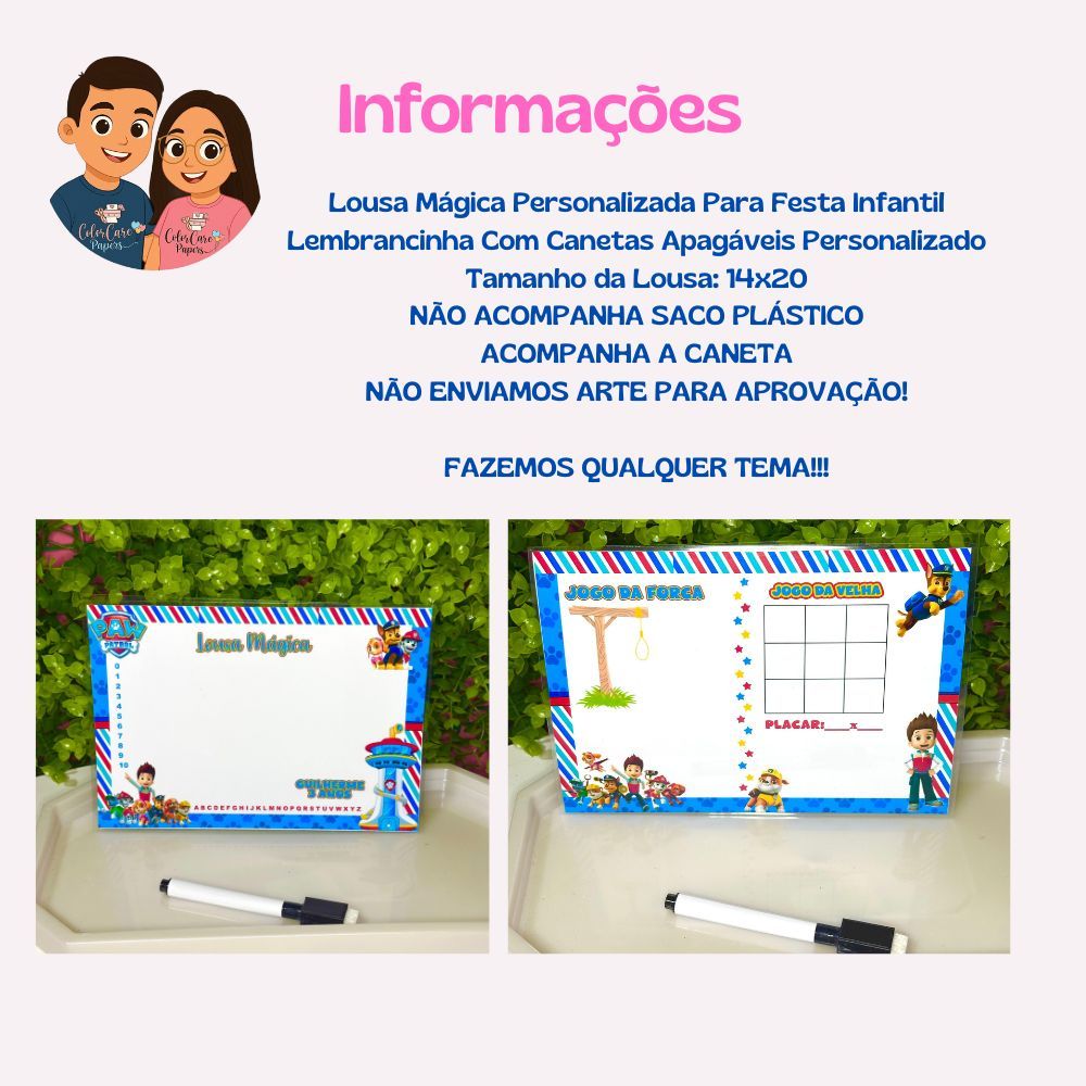 🎉 Olá Bem-vindo! Somos da Colorcare O PRAZO DE PRODUÇÃO SÃO 7 DIAS (( ÚTEIS)) ✨Fazemos qualquer tema personalizado -( Caso desejar colocar nome e idade na arte, avisar no chat em até 24 horas) - NÃO ENVIAMOS ARTE PARA APROVAÇÃO IMPORTANTE: 🌈 As cores das canetinhas será sempre preta. LOUSA COM CANETINHA: 🖍️ Lousa impressa frente e verso com canetinha hidrográfica. Características Principais: Tamanho da Lousa: 14 x 20 cm (metade de uma folha A4) Tipo de marcador: Permanente Material Da Lousa: Papel 180g Plastificado no de 125g Informações Importantes: ENVIE NOME E IDADE NO ATO DA COMPRA! SE CASO NÃO FOR INFORMADO NO PRAZO DE 24h MOMENTO DE APROVAÇÃO DA COMPRA ENVIAREMOS SEM NOME OU IDADE PARA EVITAR ATRASOS 🕐 ⏳ Fique atento ao prazo de produção e confirme com a data do seu evento , pois não nos responsabilizamos por atraso da transportadora Qualquer dúvida estamos à disposição! 🤗