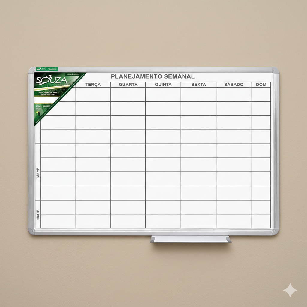 Quadro De Aviso Planejamento Semanal Para quem procura facilitar seu dia a dia o quadro branco Souza é ideal para reuniões e comunicação interna na empresa. Modelo moldura confeccionada em material alumínio popular e tela feita em chapa dura de alta densidade com gravação dos dias da semana para auxiliar a fazer planejamentos semanais. Quadro possibilita fixação na parede.