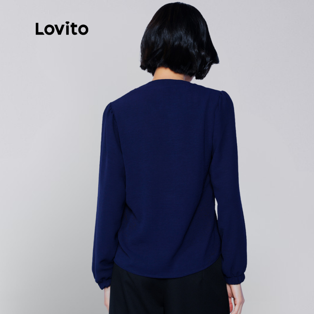Lovito Blusa Azul Social Gola Manga Longa com Elastico na Manga Elegante Lisa Feminina LB905BRL935