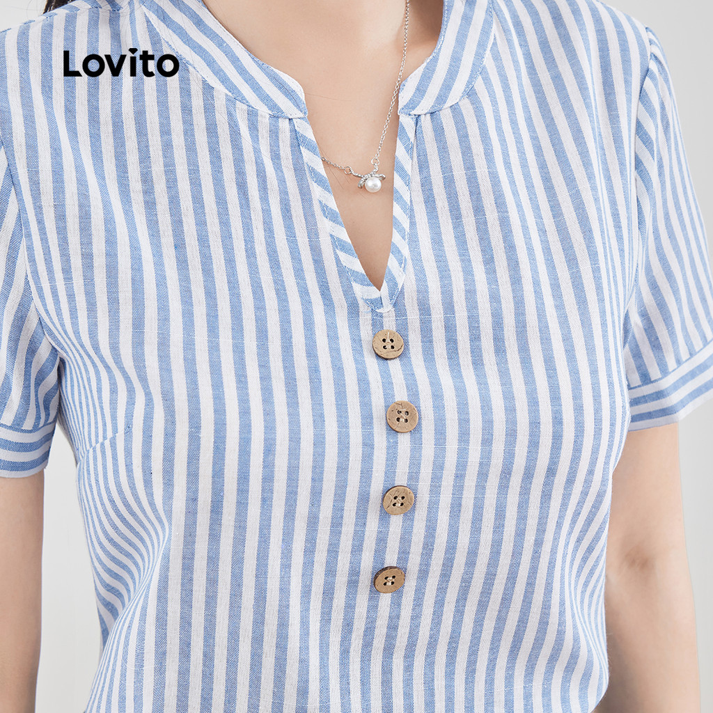 Lovito Blusa Boho com Botão Blusa Azul Leve e Confortável para Primavera/verão para mulheres L137ED187
