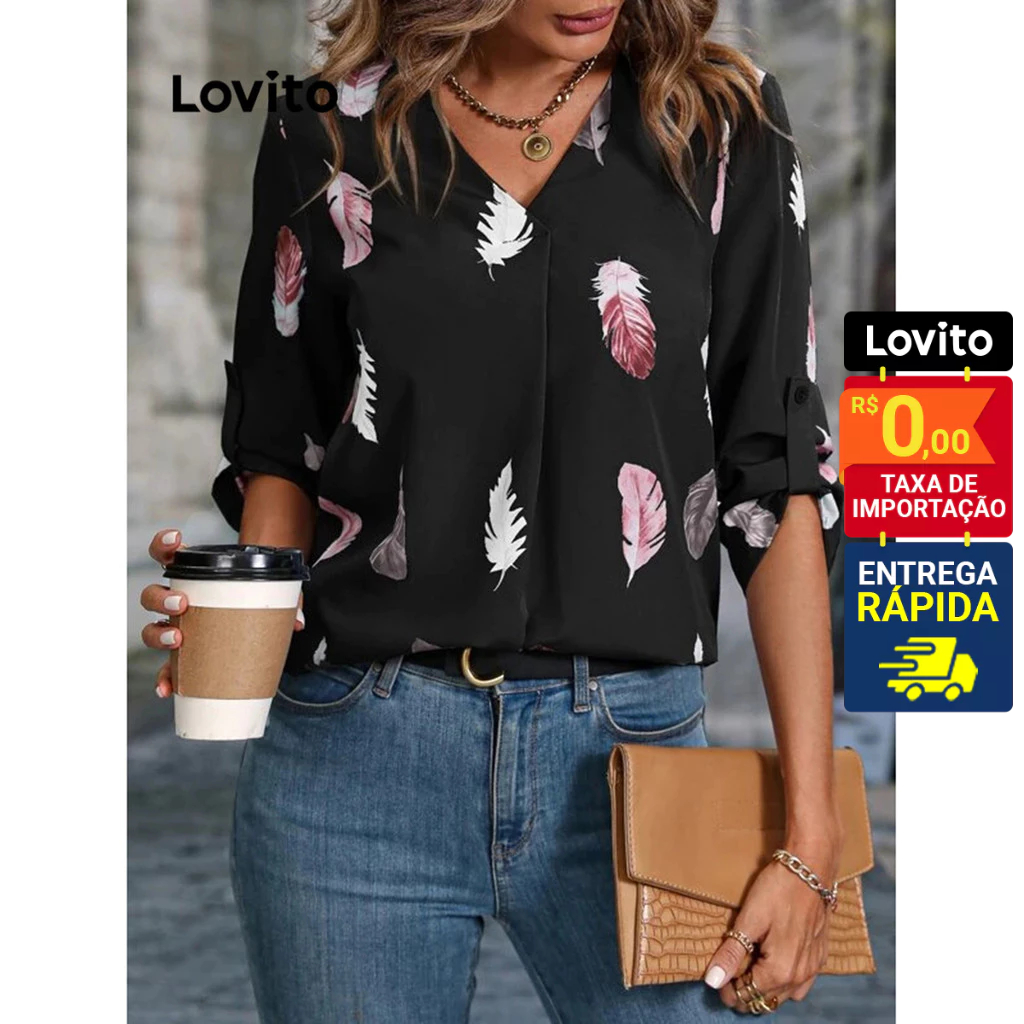 Lovito Blusa Camisa Meia Manga com Decote V Estampada com Penas Feminina LNE31096