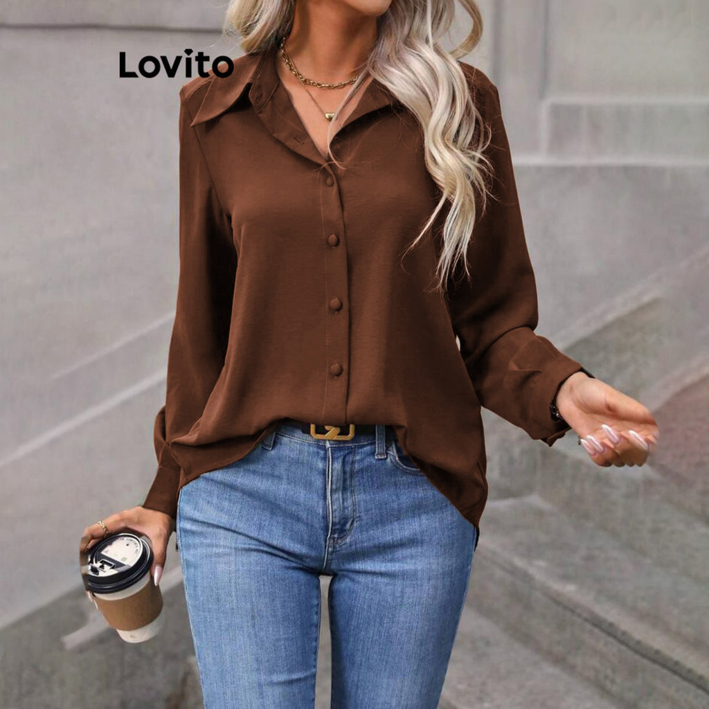 Lovito Blusa Casual Blusa Frontal Com Botão Liso Para Mulheres LNL298