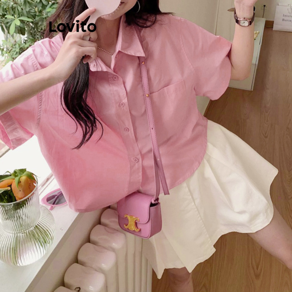 Lovito Blusa Casual Blusa Lisa Com Bolso E Botão Para Mulheres L79AD006 (Multicolorido)