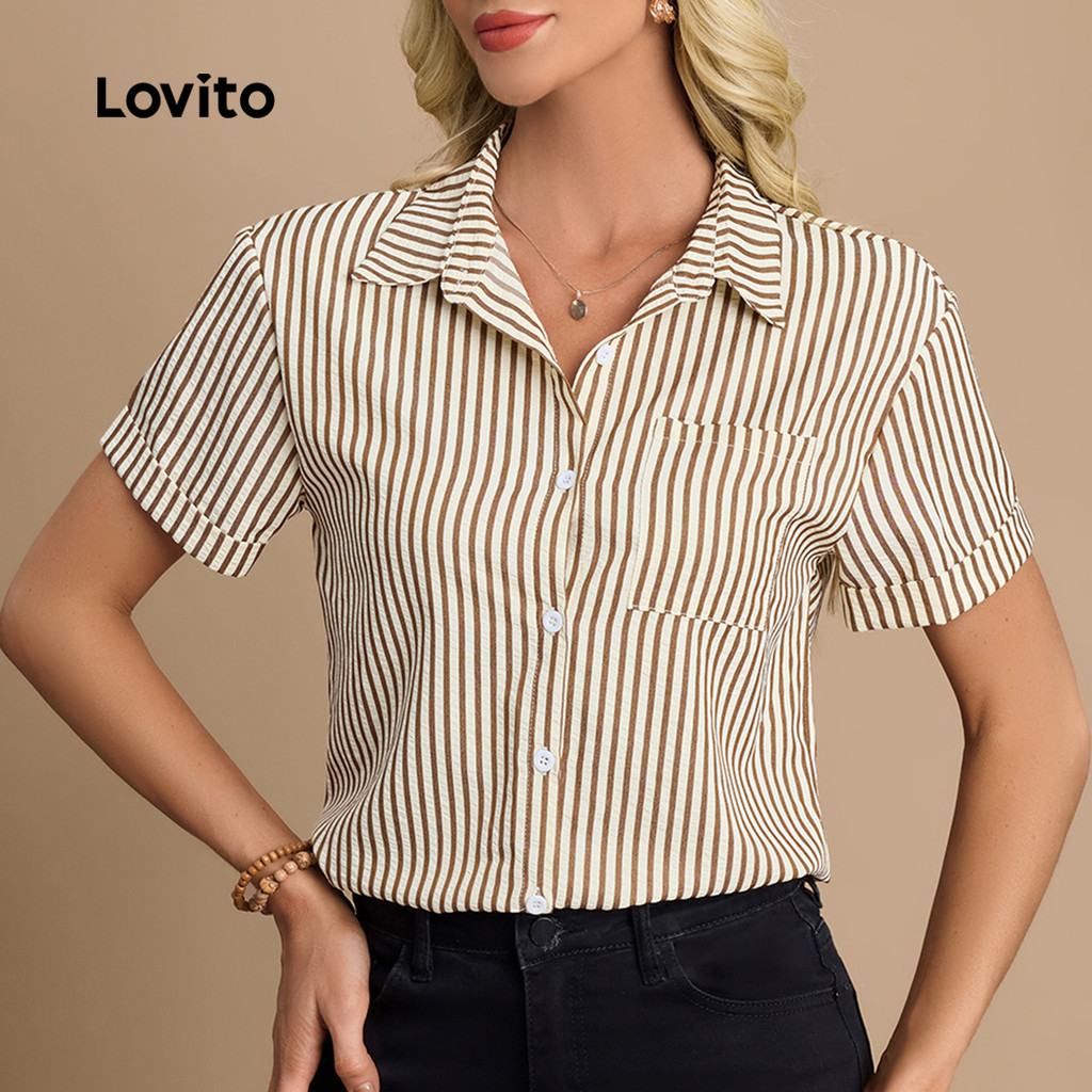 ✅DESTAQUES -❤️Bolso -❤️Botão -❤️Boa Textura -❤️Primavera e verão -❤️Com bolsos ✅DESCRIÇÕES Estampa / Padrão: listrado Estilo:Casual Tamanho Plus:Não Material:Poliéster Composição:100% Poliéster Tipo de modelagem: Ajuste regular Transparência:Não Esticar:Sem elasticidade Feito na China ✅O PACOTE INCLUI 1XBlusa ✅INTRODUÇÃO LOVITO A Lovito é uma marca em crescimento que acredita no poder das meninas. Estamos comprometidos em oferecer opções de roupas fashion e acessíveis, para todos os estilos, necessidades e identidades. Acreditamos que a moda deve ser divertida, liberadora e fazer você se sentir incrível. Afinal, o melhor acessório para qualquer look é a autoconfiança! ✅NOTAS DE COMPRA Antes de comprar, dê uma olhadinha na tabela de medidas disponível no site. Lembre-se de que, por serem feitas manualmente, as medidas podem variar de 1 a 2 cm. As cores dos produtos também podem ter pequenas diferenças em relação às fotos, dependendo da iluminação e das configurações do seu dispositivo. Siga nossa loja e conheça novos itens e as melhores ofertas para você!! Se você tiver alguma dúvida, converse conosco e responderemos o mais rápido possível.😊