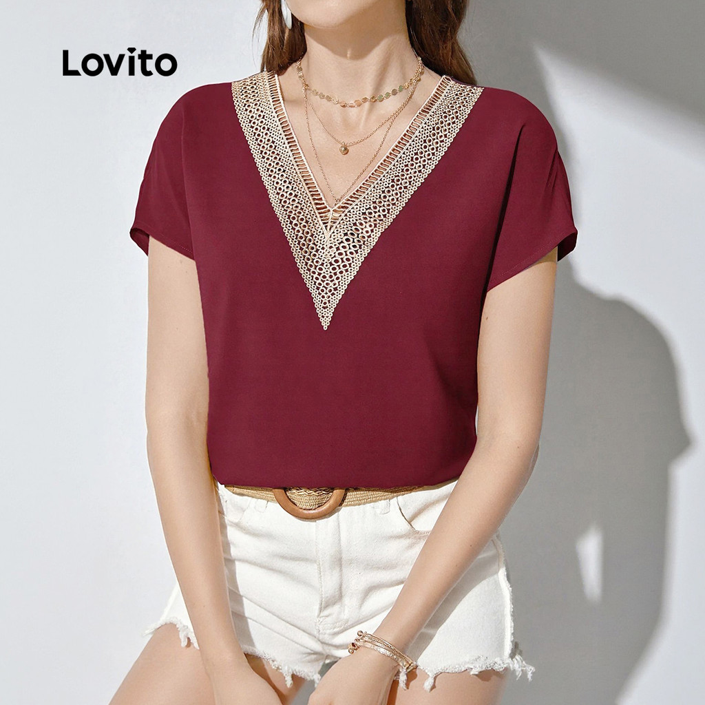 Lovito Blusa Casual De Festa Com Gola Contrastante Em Renda Vermelha Para Mulheres Ideal Para Primavera/verão L154ED364