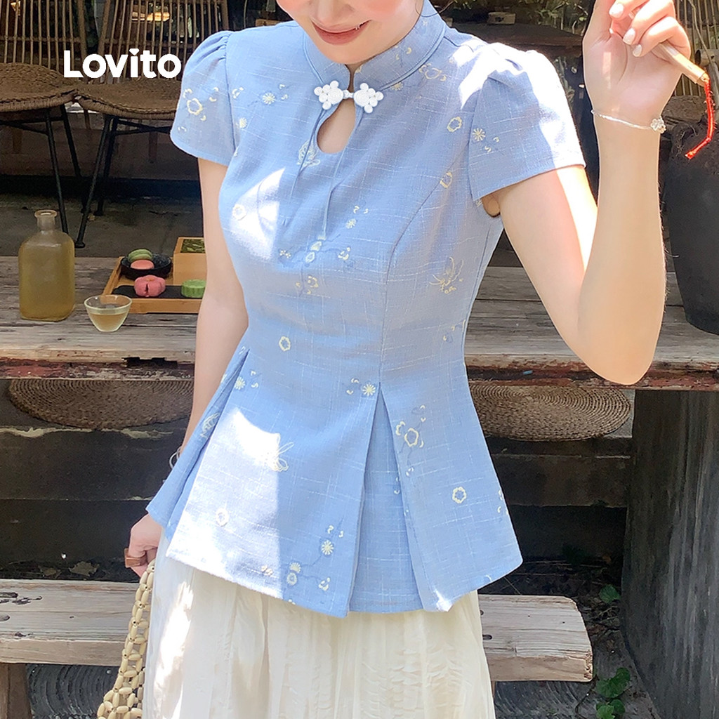 Lovito Blusa Casual Estilo Chinês Cheongsam Qipao Colorblock Azul Para Primavera/verão Para Mulheres L157ED041