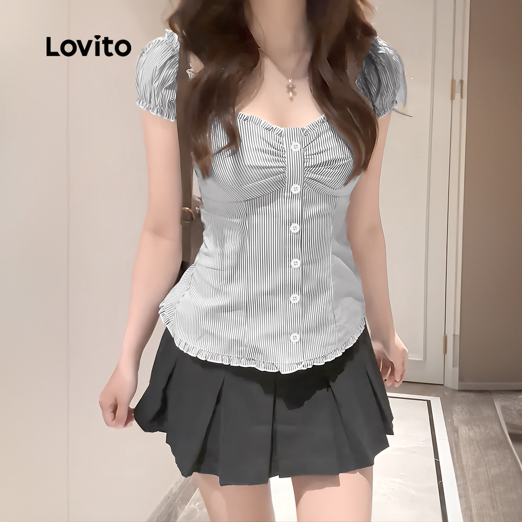 Lovito Blusa Casual Feminina Listrada Com Botões E Pregas Blusa Verão/primavera L133AD630
