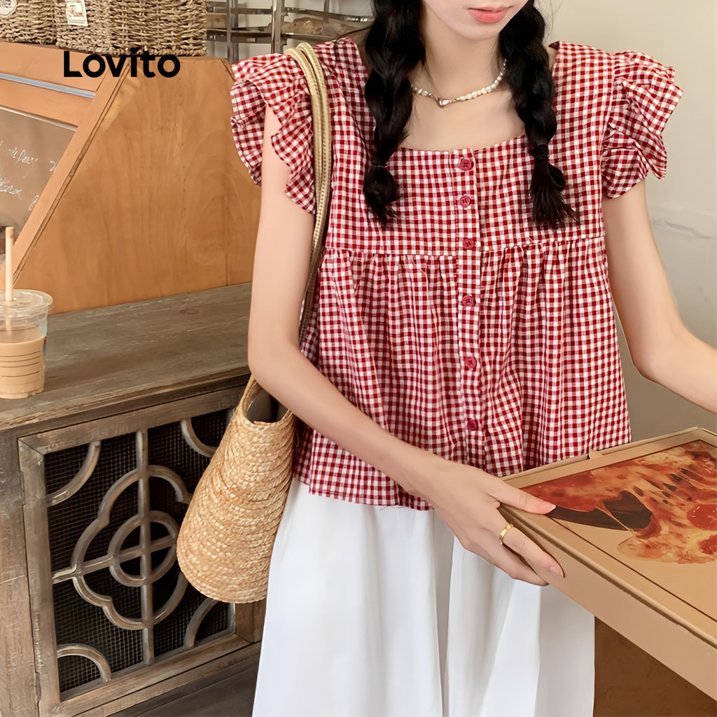 Lovito Blusa Casual Guingão Botão Babado Drapeado Manga Primavera Verão Vermelha Feminina L136AD143