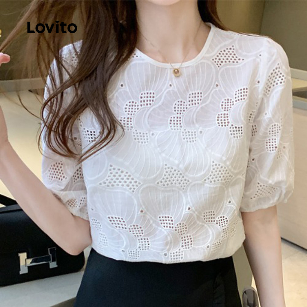 Lovito Blusa Casual Ilhó Bordado Lazer Estrutura Linha Primavera/Verão Blusa Branca Para Mulheres L135ED413