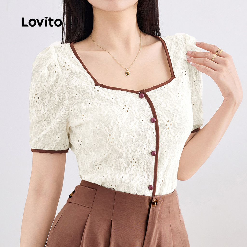 Lovito Blusa Casual Lisa Com Blocos De Cores E Bordados De Ilhós, Blusa De Verão/primavera Para Mulheres L132ED668