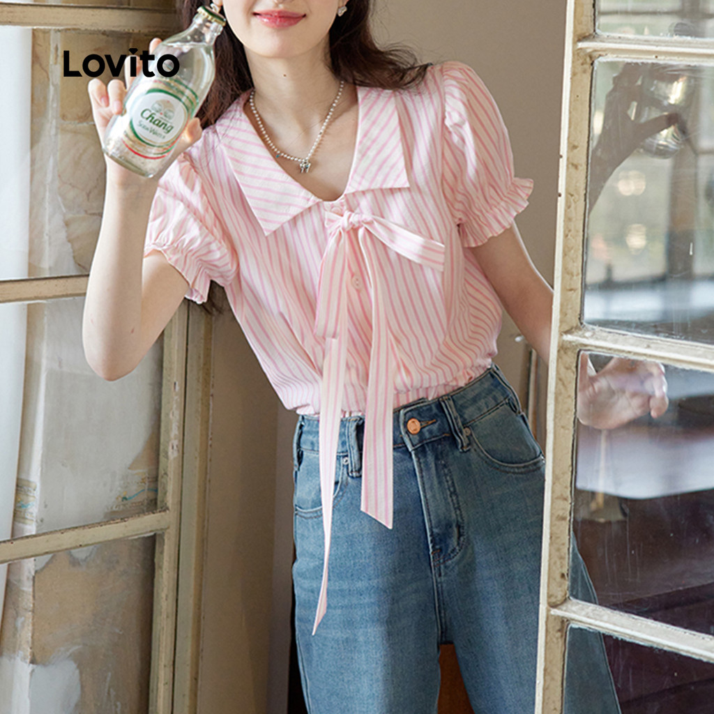 Lovito Blusa Casual Listrada Com Botão E Gravata Frontal Plissada Blusa De Verão/Primavera Para Mulheres L130AD213