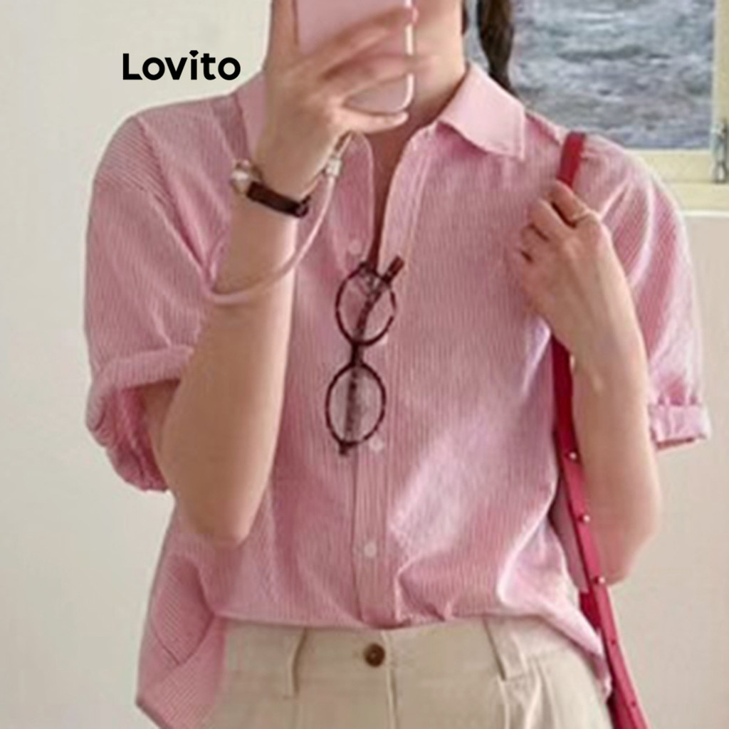 Lovito Blusa Casual Listrada Com Botões E Laço Para Mulheres LAD106666