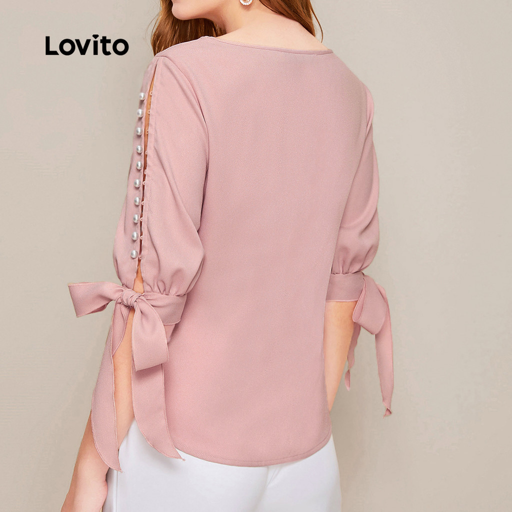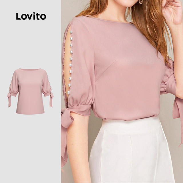 Lovito Blusa Casual oca pérolas rendas primavera/verão blusa rosa para mulheres LK3ED1723