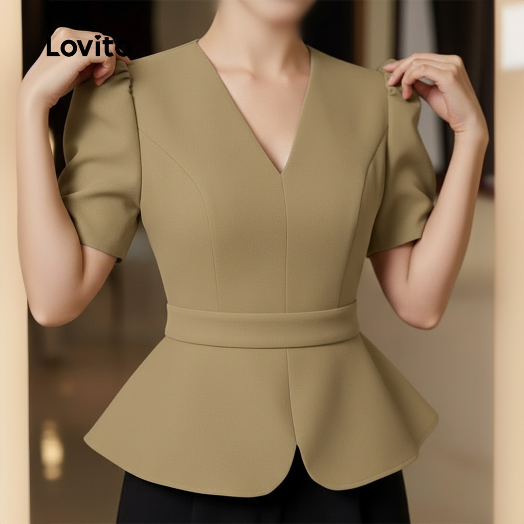 Lovito Blusa Casual Plissada Primavera/verão Blusa Cáqui para mulheres L164ED091