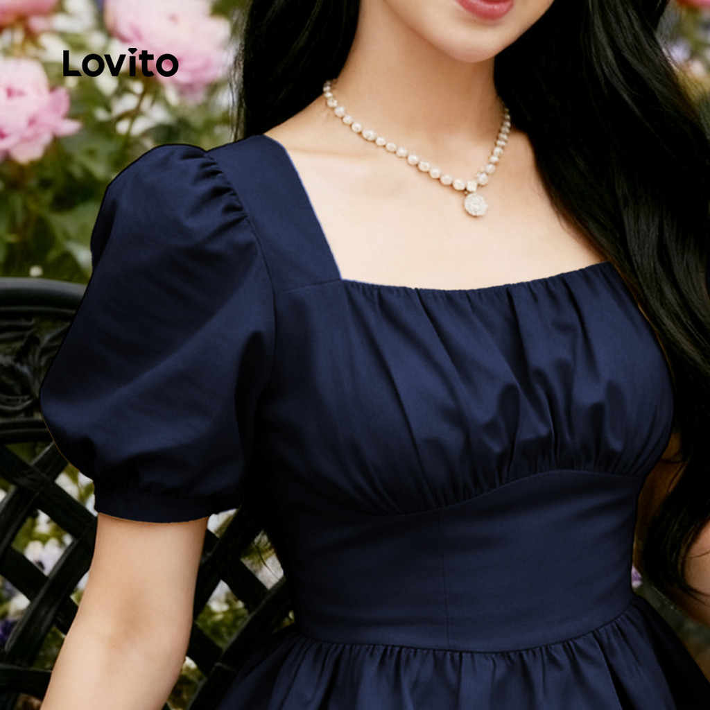 Lovito Blusa Casual Plissada Primavera/verão Blusa Feminina Azul Marinho LK2ED1668