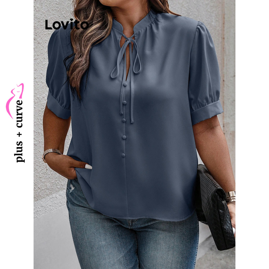 Lovito Blusa Curva Plus Size Elegante Lisa Com Cadarço E Botão Com Babados E Gola Para Mulheres LBL09414