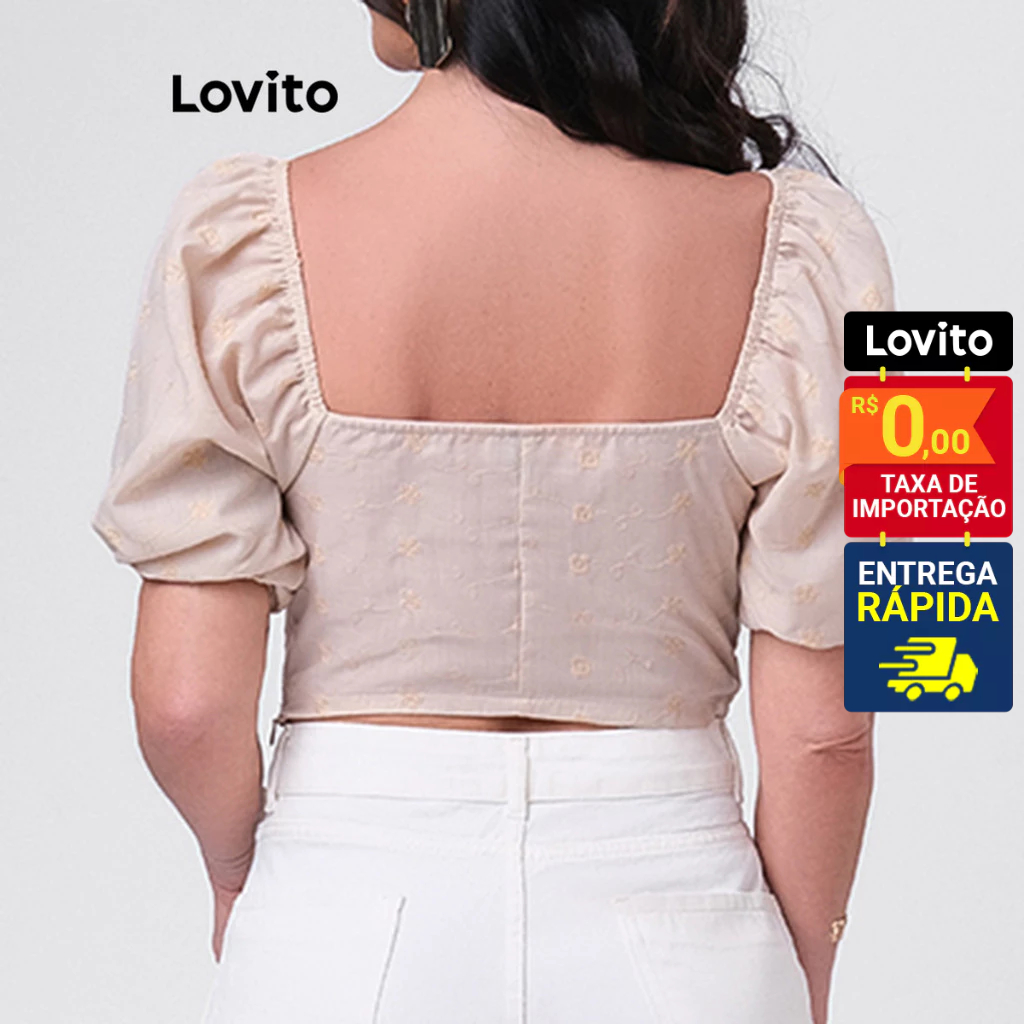 Lovito Blusa Decote Coração Manga Bufante Cropped Elegante Basica Feminina LB246BRL275