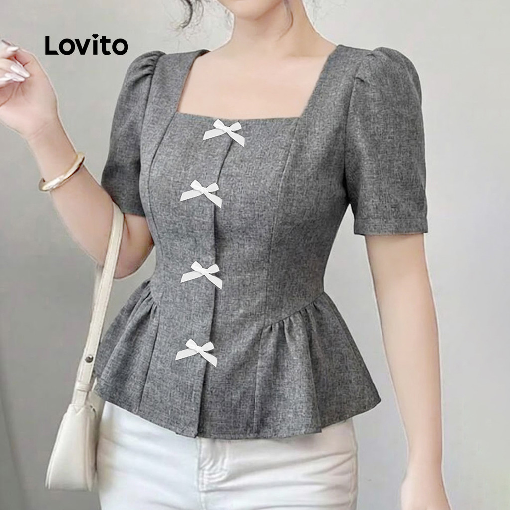 Lovito Blusa Elegante Babado Bainha Laço Colorblock Primavera/verão Cinza Blusa para Mulheres. L177ED093