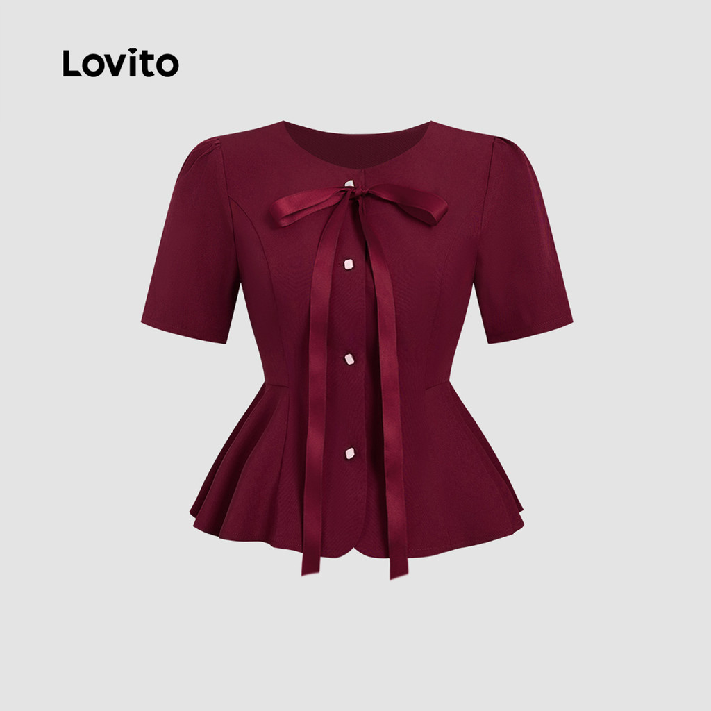 Lovito Blusa Elegante com Botões Babado Na Bainha Laço Frontal Primavera/verão Vermelho vinho L155ED856\5