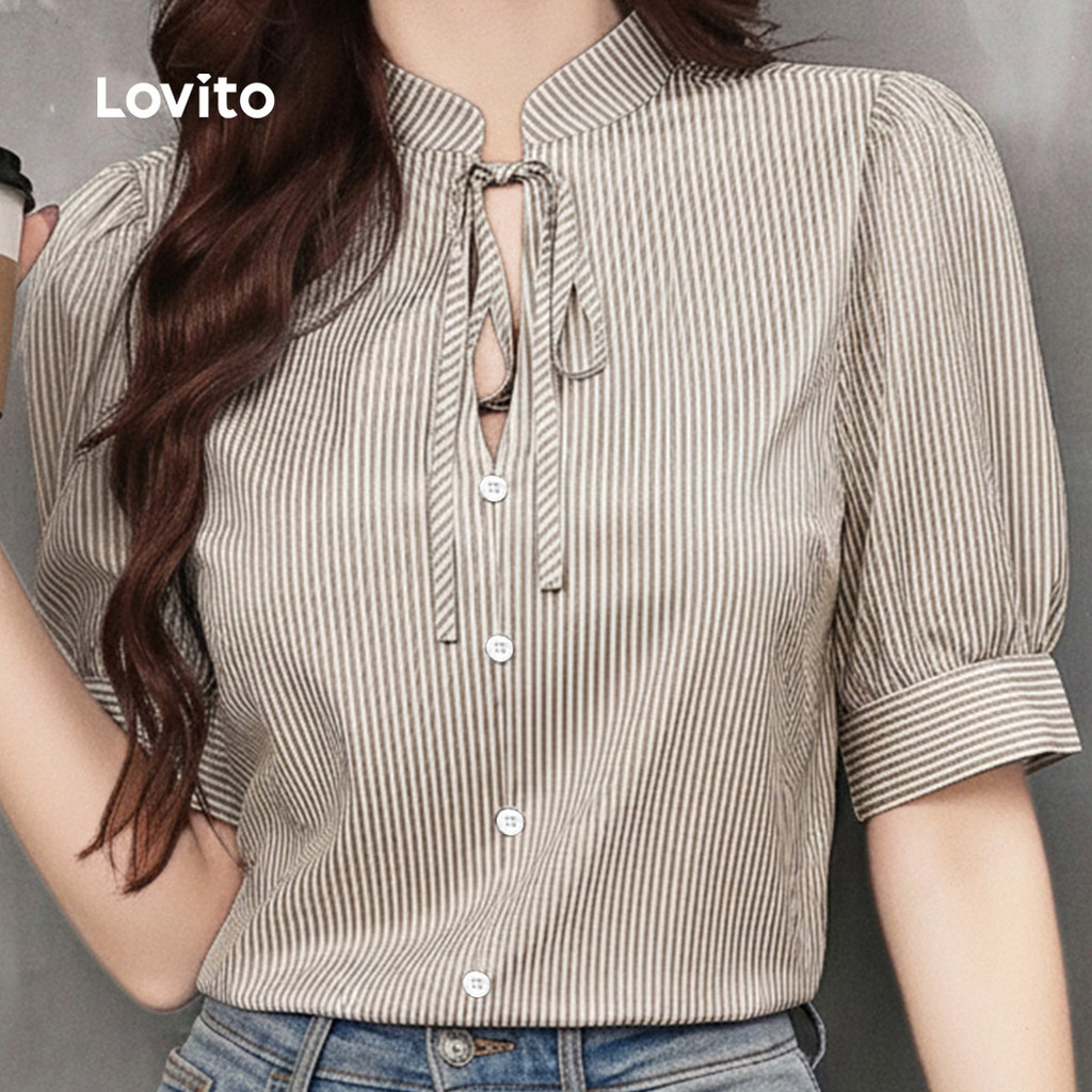 ✅DESTAQUES -❤️Amarrar -❤️Padrão -❤️Sensação de mão suave -❤️Primavera e verão ✅DESCRIÇÕES Estampa / Padrão:Listrado Estilo:Elegante Tamanho Plus:No Material:Poliéster Composição:100%Polyester Tipo de modelagem:Regular Fit Transparência:No Esticar:Non-stretch Feito na China ✅O PACOTE INCLUI 1XBlusa ✅INTRODUÇÃO LOVITO A Lovito é uma marca em crescimento que acredita no poder das meninas. Estamos comprometidos em oferecer opções de roupas fashion e acessíveis, para todos os estilos, necessidades e identidades. Acreditamos que a moda deve ser divertida, liberadora e fazer você se sentir incrível. Afinal, o melhor acessório para qualquer look é a autoconfiança! ✅NOTAS DE COMPRA Antes de comprar, dê uma olhadinha na tabela de medidas disponível no site. Lembre-se de que, por serem feitas manualmente, as medidas podem variar de 1 a 2 cm. As cores dos produtos também podem ter pequenas diferenças em relação às fotos, dependendo da iluminação e das configurações do seu dispositivo. Siga nossa loja e conheça novos itens e as melhores ofertas para você!! Se você tiver alguma dúvida, converse conosco e responderemos o mais rápido possível.