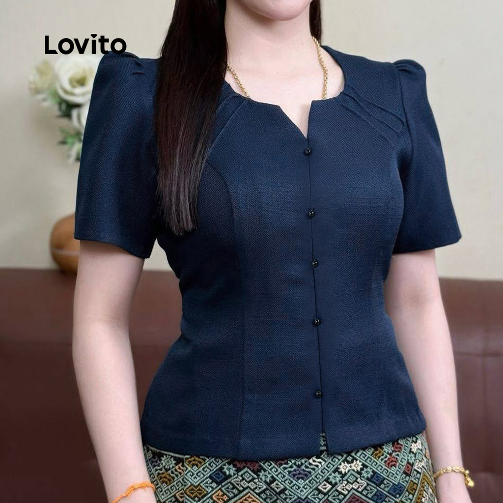 Lovito Blusa Elegante De Festa Botões Frontais E Modelagem Estruturada Azul Marinho Mulheres Primavera/verão L165ED037
