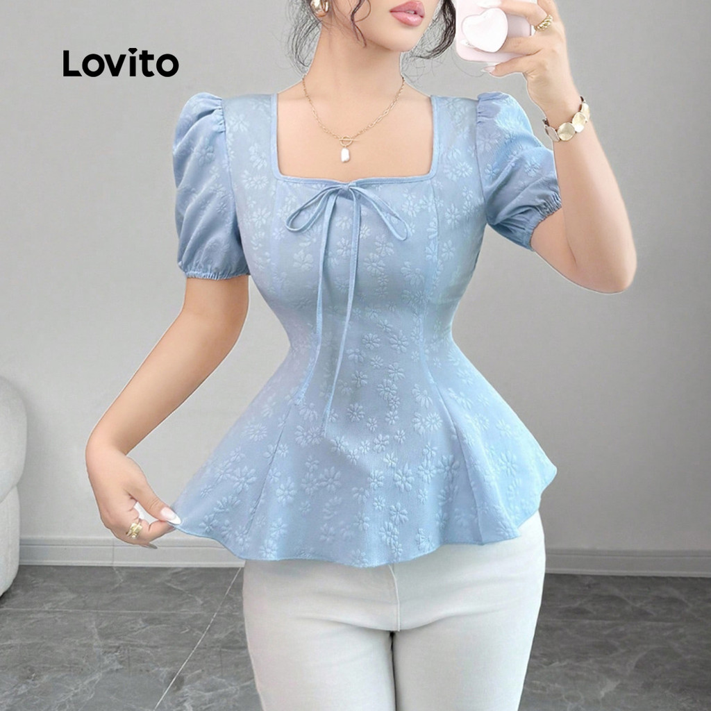 Lovito Blusa Elegante Laço Jacquard Azul Blusa para Mulheres L171AD011