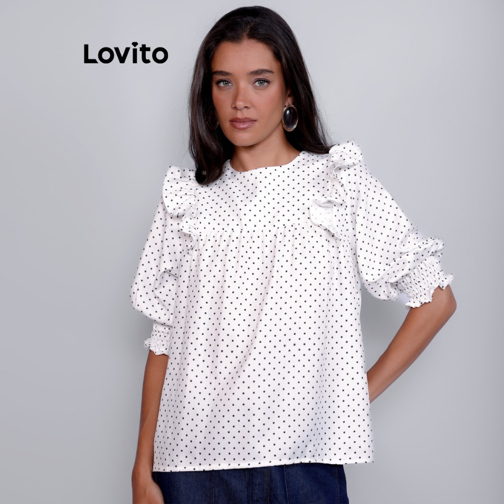 Lovito Blusa Elegante Manga Bufante Babado Moda Modesta Poá Feminino BRBLB366BRL395