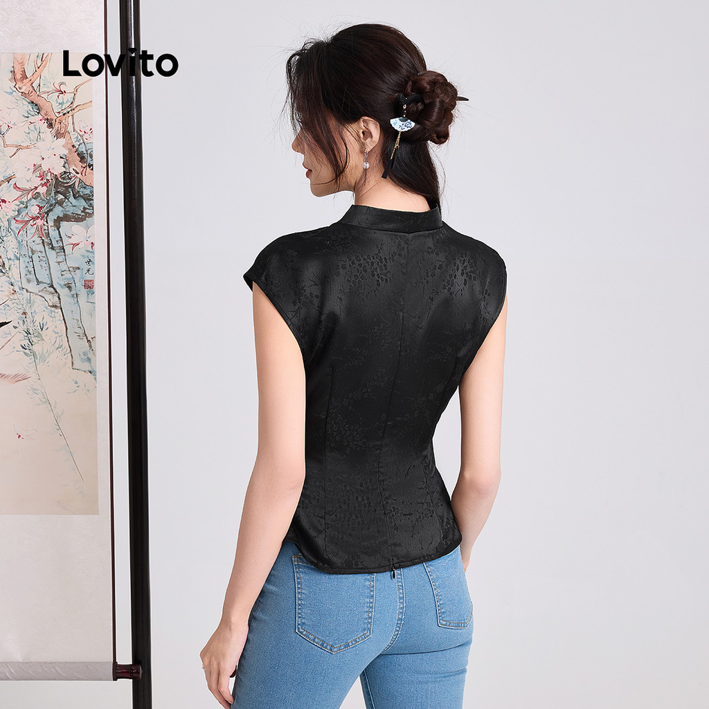 Lovito Blusa Elegante Nova Cheongsam Chinesa Estilo Qipao Primavera/verão Blusa Preta para Mulheres L166AD1064