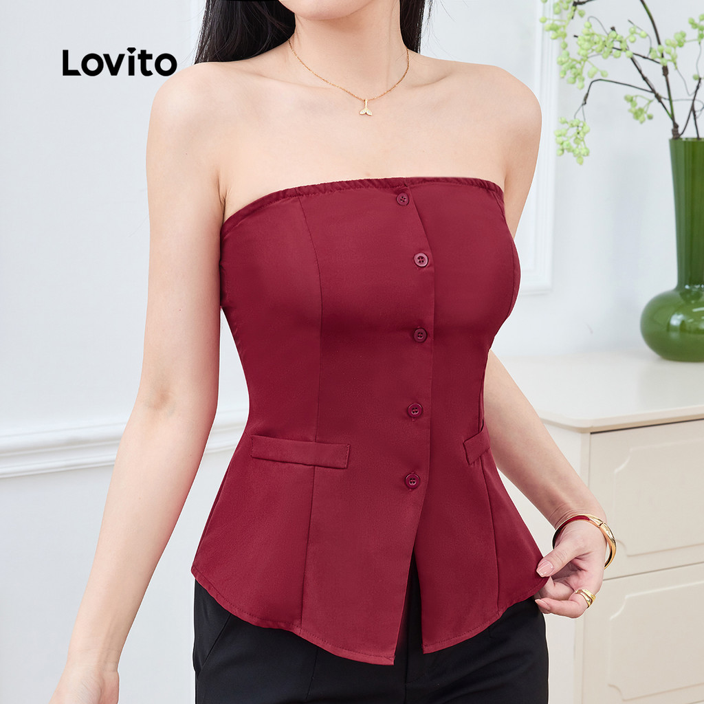 Lovito Blusa Elegante Vermelha Festa Botões Frontais E Bolso Falso Blusa Requintada Cor Vinho Primavera/verão L171ED559