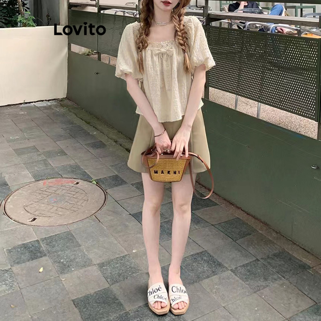 Lovito Blusa Feminina de Renda com Gola Quadrada e Malha Lisa em Contraste LNE19122 (Damasco)